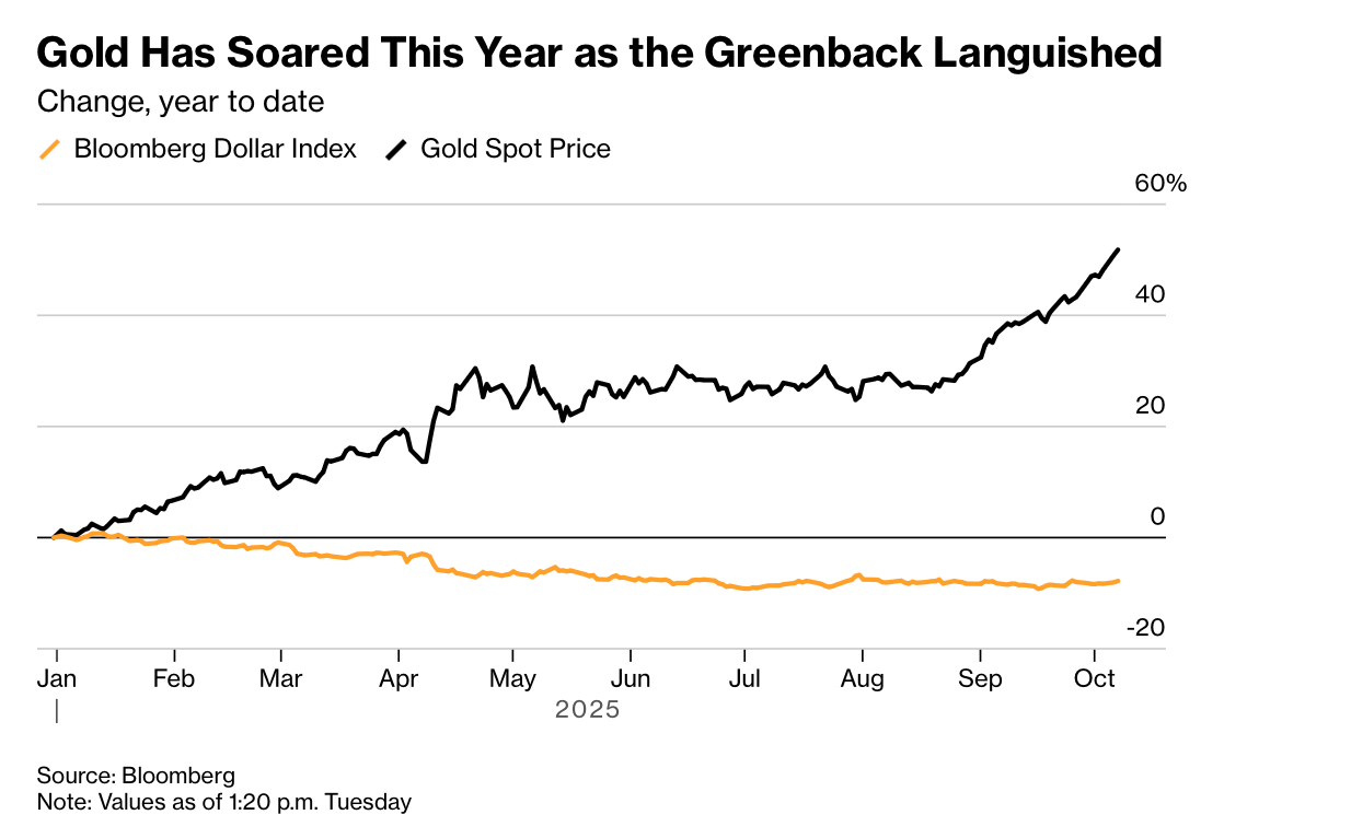 Normally, equities and gold move in opposite directions. Stocks up, gold down. Fear or faith, pick one. But not now. The S&P is surging on AI optimism while gold is surging toward $4,000 an ounce. It is up 51% this year, the best performing asset this year2. The dollar is down 10%3. Both fear and faith are rallying simultaneously, which is rare and usually not a great sign.