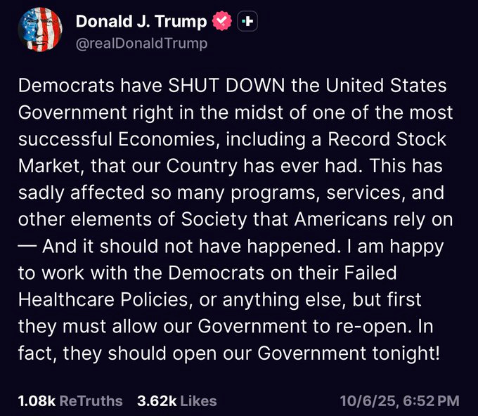 In the below image, Trump highlights both. He says that the Democrats have shutdown the government, citing a successful economy AND a successful stock market (but sometimes it’s Bidens economy, so you never really know). He says he is open to meeting about healthcare, which is great progress toward ending said shutdown.