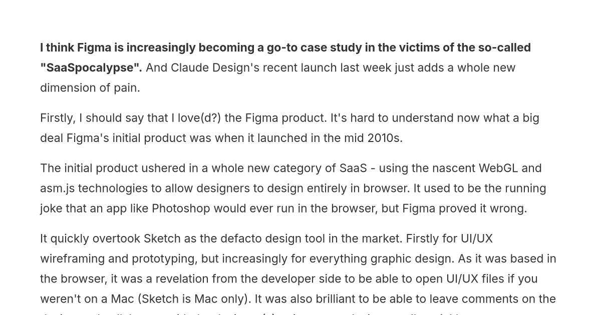 I think Figma is increasingly becoming a go-to case study in the victims of the so-called "SaaSpocalypse". And Claude Design's recent launch last week just adds a whole new dimension of pain.
